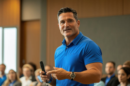 An energetic speaker captivates the audience with insights at a professional development seminar in a modern setting.