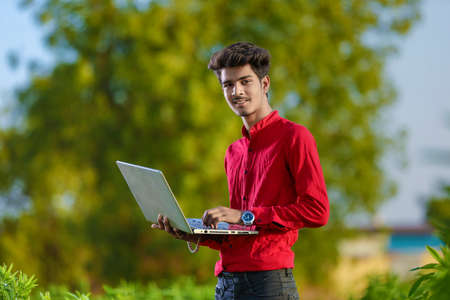 Young indian bank executive standing at field with laptop