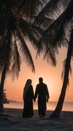 Silhouette of Muslim couple on the beach at sunset