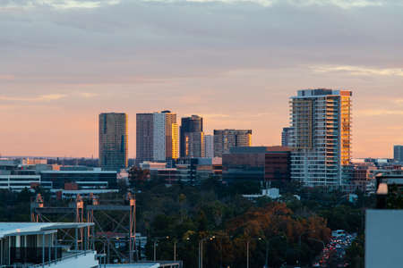 Sydney, Australia - June 12, 2021: Rhodes building skyline at sunset time.