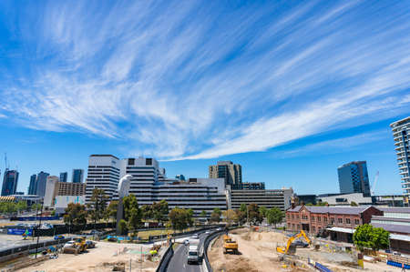 Melbourne, Australia - December 7, 2016: Wurunjery way with construction site and stunning Melbourne cityscape on the background