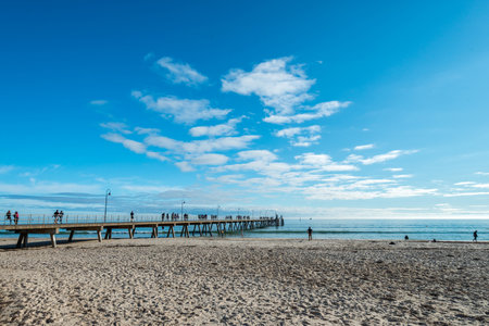 Adelaide, Australia - August 16, 2015: People walking along Glenelg Beach jetty on a warm summper day