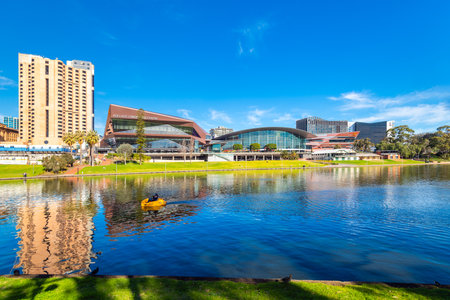Adelaide, Australia - January 13, 2017: Adelaide city skyline with its iconic buildings viewed across Torrens river in Elder Park on a bright day