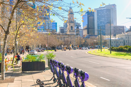 Adelaide, South Australia - August 13, 2019: Beam E-scooters parked near Victoria Square and ready to ride on a bright morning