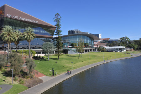 Adelaide, Australia - September 11, 2016: Adelaide Convention Centre viewed from the north side of Torrens river in Elder Park on a bright day
