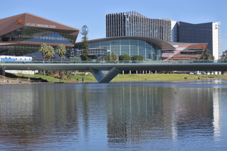 Adelaide, South Australia - August 4, 2019: Adelaide Riverbank viewed towards Rotunda across the Torrens River from the footbridge on a bright day