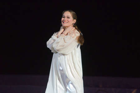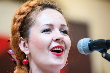 ORENBURG, ORENBURG region, RUSSIA, 12 October, 2014 year. Day of the Orenburg downy shawl in MOL Armada. The girl sings