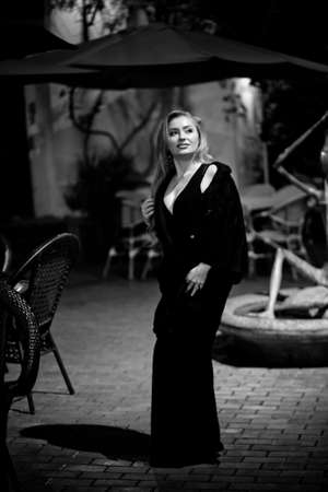 Luxury beautiful blonde with long hair blowing in a black evening dress
