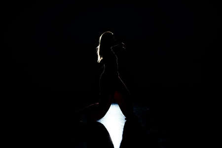 The hand in her hair. Beautiful young girl dancing. Hair flying. Shooting in Studio