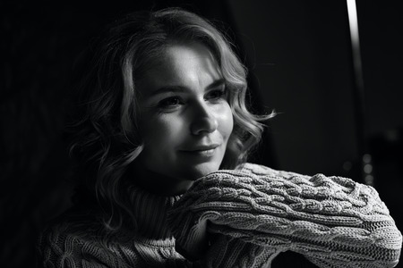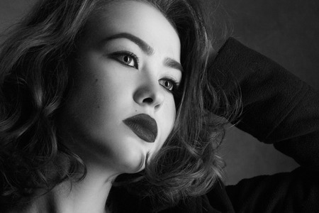 Black and white portrait of a beautiful woman on a dark background