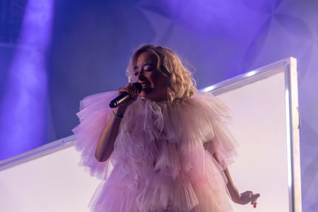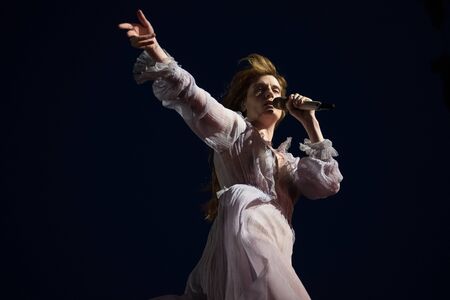 BONTIDA, ROMANIA - JULY 19, 2019: Singer of Florence and the Machine English indie rock band singing live on the stage during a concert at Electric Castle festival