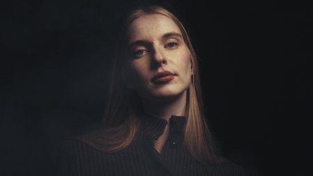 Close up portrait of a fashion model showcasing captivating eyes, highlighted by dramatic lighting that casts shadows across her face, creating a mysterious and alluring atmosphere
