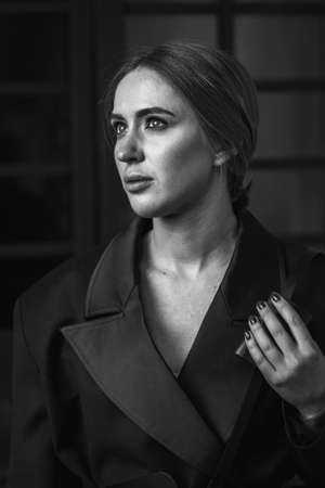 Portrait of young beautiful hipster woman in the city streets in black and white