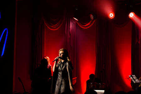 Singer with her band performing on stage. Concert. View from the auditorium.