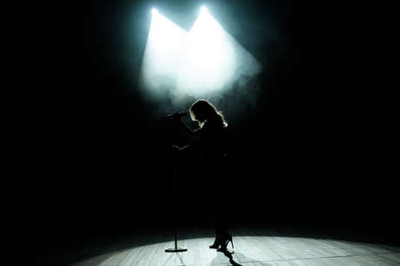 Performing female singer in dark top holding microphone and singing on stage, with lights and haze. Concert, performance, stage, lighting, music, entertainment, atmosphere