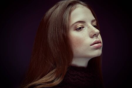 Portrait of a pretty modern girl teenager with brown hair and freckles. Studio portrait on a dark blue background.