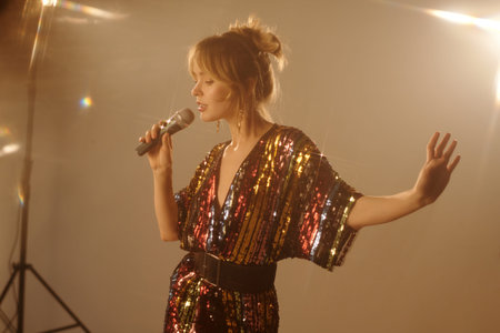 Waist up portrait of young woman singing into microphone during music video shoot with warm lighting in studio