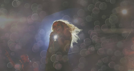 Female singer, performing her vocal sound. With lens flare and spotlight.