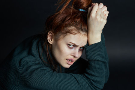 Young girl trying to find solace while her hair are falling on her face in a concept of depression