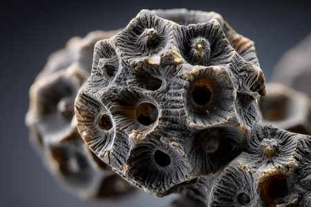 Close-up of fossilized coral with porous surface, displaying intricate patterns and textures. The coral structure reveals circular openings, showing natural beauty in detailed form
