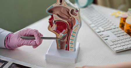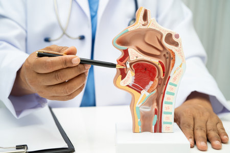 Asian doctor with nasal oral throat cavity neck human anatomy model for study diagnosis and treatment in hospital.