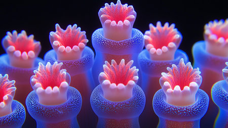A macro view of coral polyps with vibrant blue tubular bodies covered in tiny white speckles and glowing pink, flower-like oral discs.