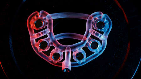 bright surgical template for the installation of six implants, top view with red-blue illumination