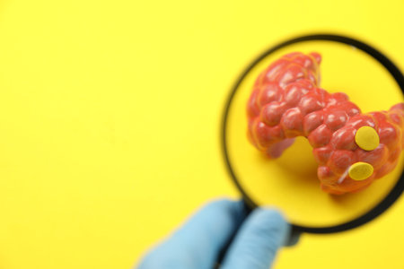 Endocrinologist looking at model of thyroid gland through magnifying glass on yellow background, closeup. Space for text