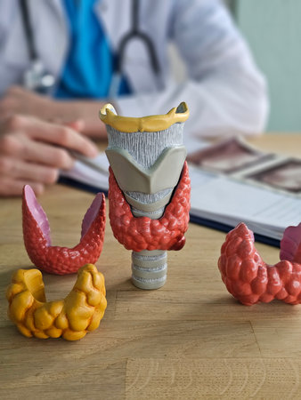 Models of thyroid anatomy on a wooden table with a person taking notes in a medical setting