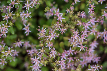 texture background of Sedum plants Spanish in drops of dew. close-up, selective focus, macro photo