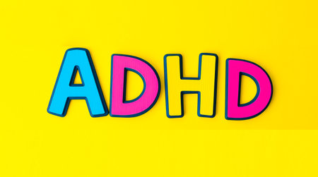 Colorful sticky notes feature the letters ADHD in bold black font. The notes symbolize awareness and understanding of attention deficit hyperactivity disorder in a creative and impactful way..