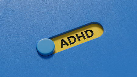 Attention deficit hyperactivity disorder. Text abbreviation on slide switch.close up of slide switch,3D rendering on blue background.