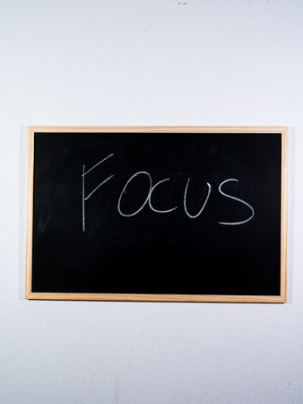 Chalkboard showing FOCUS concept written vertically representing mental clarity, discipline and goal orientation
