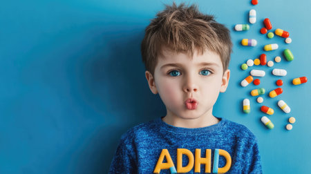 Caucasian boy with ADHD surrounded by various colorful pills on blue background
