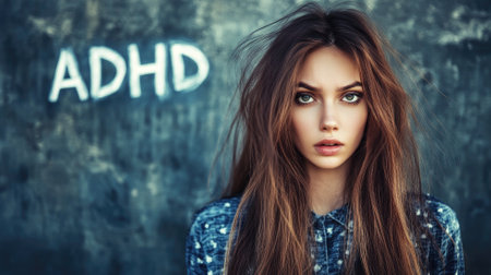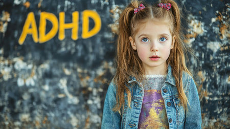 Fair-skinned girl with pigtails stands against wall ADHD written on it