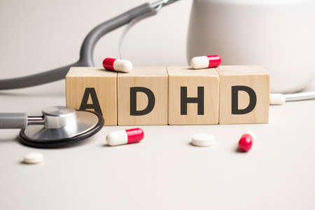 Wooden cubes with the word ADHD on a wooden background and a stethoscope on them. Medical concept