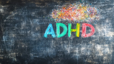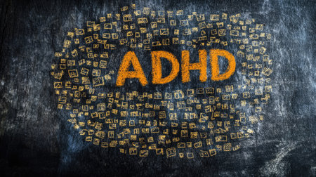 ADHD concept depicted with hand-drawn icons on chalkboard