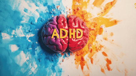 Artistic representation of brain with ADHD, set against abstract blue and orange paint splatters