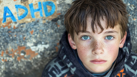 Young Caucasian boy with attention deficit hyperactivity disorder Wearing hoodie, looking serious blue eyes, freckles ADHD text in background