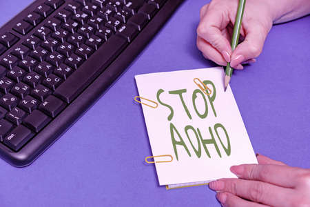 Conceptual caption Stop Adhd. Business overview Put at end the mental health disorder of children Hyperactive Hands pointing pressing computer keyboard keys typewriting new ideas.