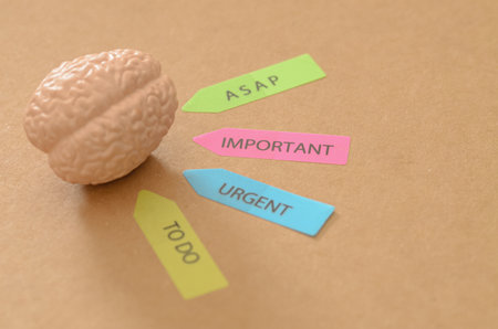Brain Model with Task Priority Sticky Tabs: ASAP, Important, Urgent, and To Do on Tan Background