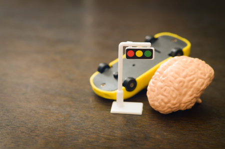 Miniature Brain and Traffic Signal with Skateboard Representing Thought, Action, and Mental Regulation