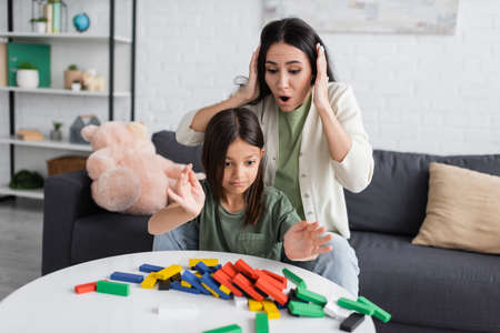 shocked nanny touching head near upset girl and colorful wooden blocks