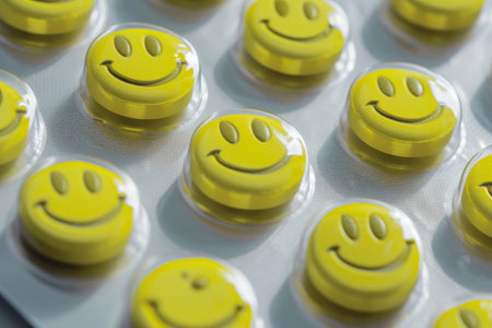 Toy blister pack of yellow smiley face pills for sweet expressions