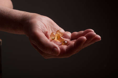 Pharmaceutical medicine colorful fish oil pills, capsules on highlighted dark background. Medicine creative concepts. Yellow capsules. Virus vaccine. Antidot.