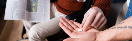 cropped view of man in black t-shirt holding blue awareness ribbon and pills