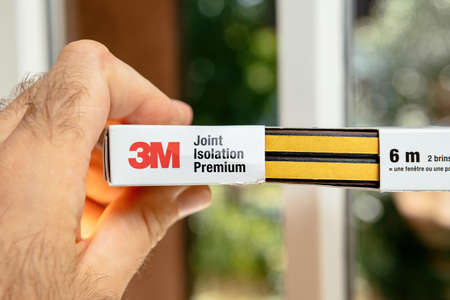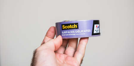 POV male hand holding new package with 3M professional painters violet scotch