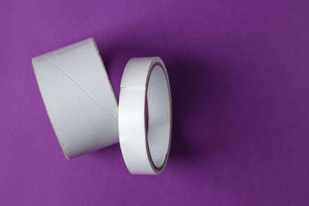 Two rolls of sticky adhesive scotch tape on purple background