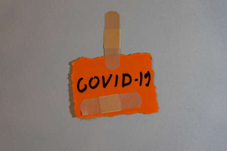 Paper note with the inscription COVID-19 on a gray background. A note with ragged edges. Close up. Protection against viruses and bacteria. Stop coronavirus. Worldwide coronavirus epidemic.COVID-19.