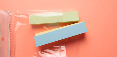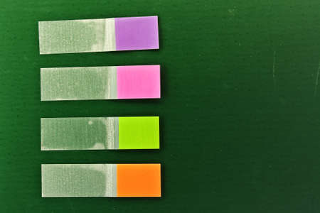 bright colored sticky notes on a yellow background in a row, copy space, selective focus